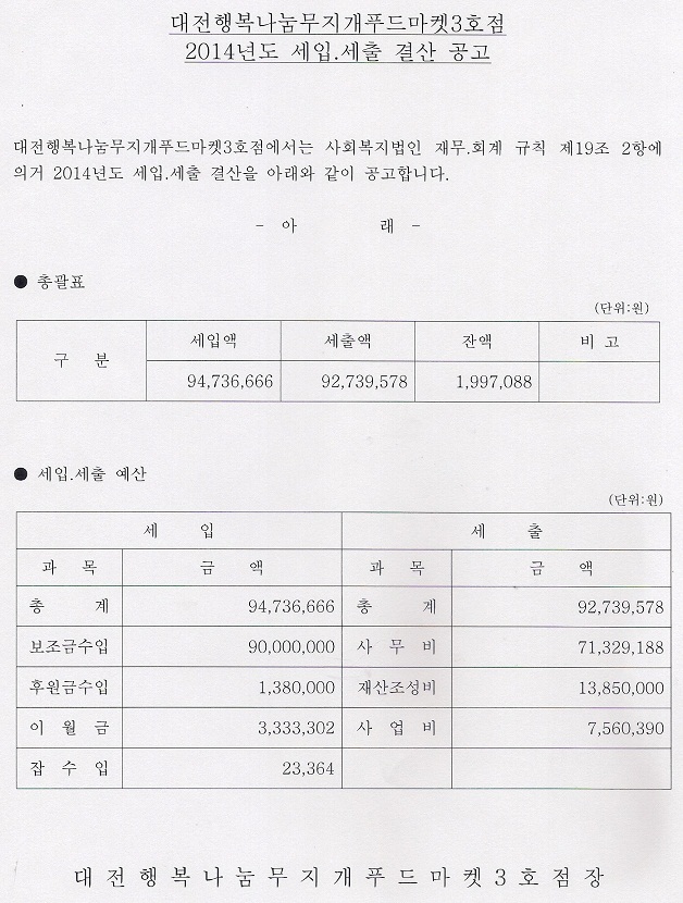 19-03-28 11:19 대전행복나눔무지개푸드마켓3호점 2014년도 세입.세출 결산공고 페이지 정보 작성자 성우보육원 댓글 0건 조회 5,311회 본문 대전행복나눔무지개푸드마켓3호점 2014년도 세입.세출 결산공고 목록 댓글목록 댓글목록 등록된 댓글이 없습니다.