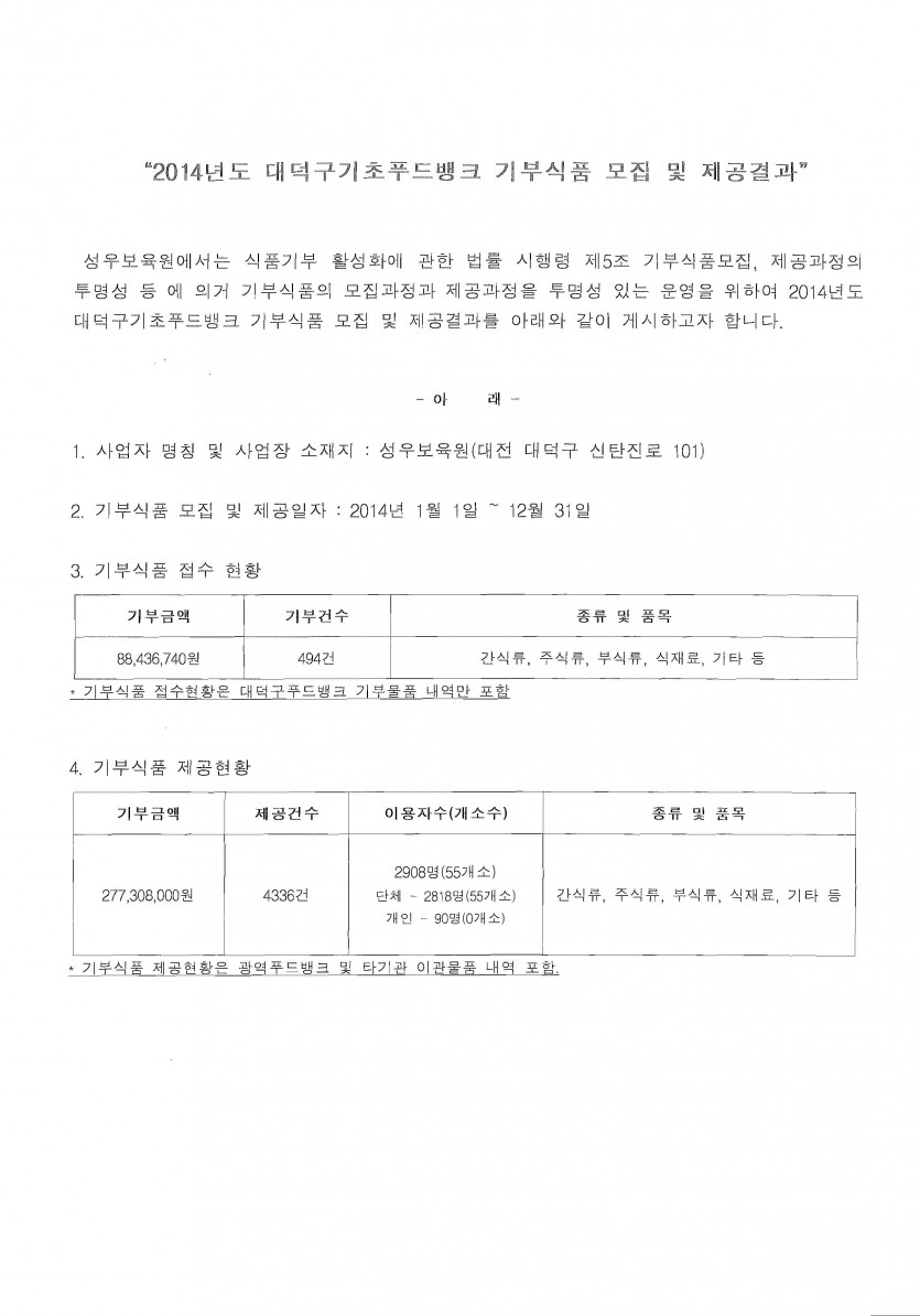 19-03-28 11:21 2014년 대덕구기초푸드뱅크 운영실적(기부식품 모집 및 제공결과) 페이지 정보 작성자 성우보육원 댓글 0건 조회 5,742회 본문 2014년 대덕구기초푸드뱅크 운영실적(기부식품 모집 및 제공결과) 을 게시합니다. 목록 댓글목록 댓글목록 등록된 댓글이 없습니다.