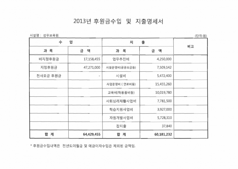 19-03-28 10:59 <공고>2013년 후원금 수입 및 지출명세서 페이지 정보 작성자 성우보육원 댓글 0건 조회 6,124회 본문 2013년 후원금 수입 및 지출명세서 목록 댓글목록 댓글목록 등록된 댓글이 없습니다.
