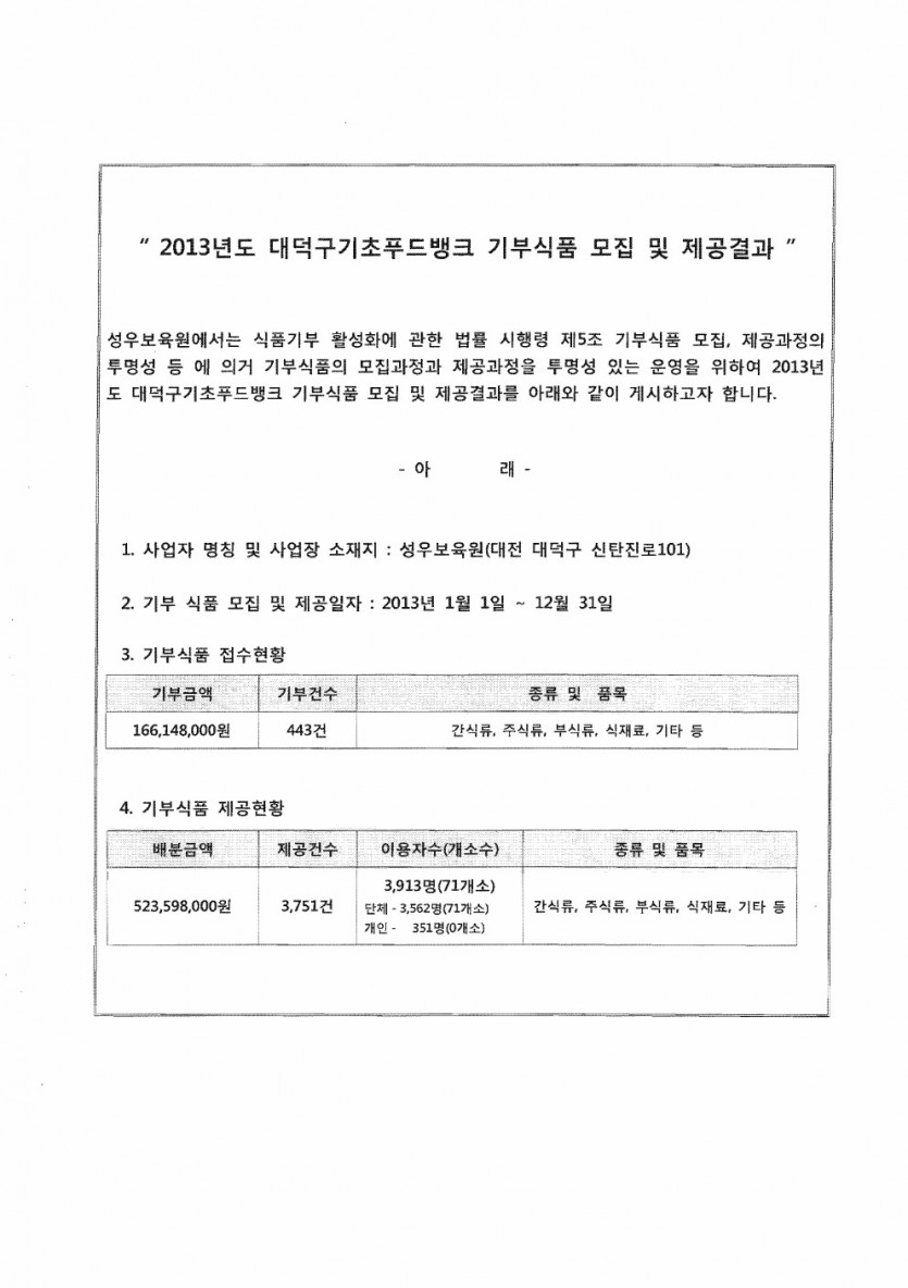 19-03-28 11:00 2013년 대덕구기초푸드뱅크 운영실적(기부식품 모집 및 제공결과) 페이지 정보 작성자 성우보육원 댓글 0건 조회 5,550회 본문 2013년도 대덕구기초푸드뱅크 운영실적(기부식품 모집 및 제공결과)을 게시합니다. 목록 댓글목록 댓글목록 등록된 댓글이 없습니다.