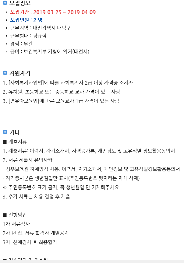 19-03-25 11:50 (공고) 생활지도원 모집 페이지 정보 작성자 성우보육원 댓글 0건 조회 6,197회 본문 생활지도원 모집 ※ 정확한 정보는 복지넷 공고 참고해주세요. 목록 댓글목록 댓글목록 등록된 댓글이 없습니다.