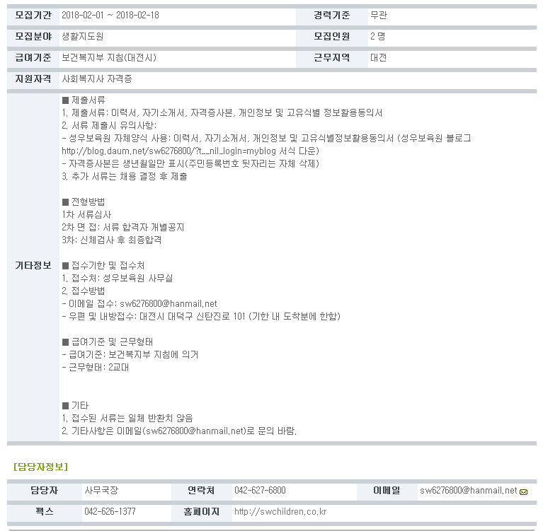 19-03-28 11:43 (공고)생활지도원 모집 페이지 정보 작성자 성우보육원 댓글 0건 조회 5,573회 본문 (공고)생활지도원 모집 목록 댓글목록 댓글목록 등록된 댓글이 없습니다.