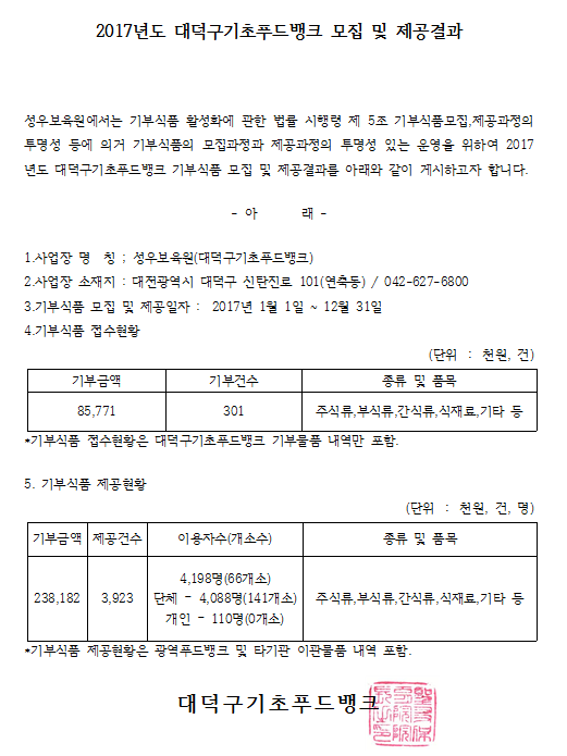 19-03-28 11:43 2017년도 대덕구기초푸드뱅크 모집 및 제공결과 페이지 정보 작성자 성우보육원 댓글 0건 조회 5,560회 본문 2017년도 대덕구기초푸드뱅크 모집 및 제공결과 목록 댓글목록 댓글목록 등록된 댓글이 없습니다.