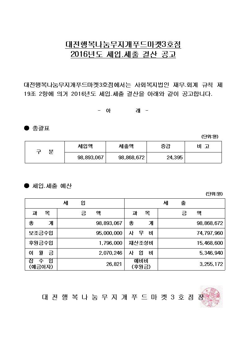 19-03-28 11:35 대전행복나눔무지개푸드마켓3호점 2016년 세입.세출 결산공고 페이지 정보 작성자 성우보육원 댓글 0건 조회 5,687회 본문 대전행복나눔무지개푸드마켓3호점 2016년 세입.세출 결산공고 목록 댓글목록 댓글목록 등록된 댓글이 없습니다.