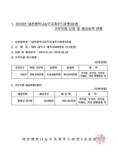 19-03-28 11:36 2016년 대전행복나눔무지개푸드마켓3호점 기부식품 모집 및 제공실적 현황 페이지 정보 작성자 성우보육원 댓글 0건 조회 5,483회 본문 2016년 대전행복나눔무지개푸드마켓3호점 기부식품 모집 및 제공실적 현황 목록 댓글목록 댓글목록 등록된 댓글이 없습니다.