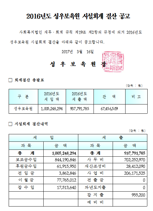 19-03-28 11:37 (공고)2016년 시설회계 결산 페이지 정보 작성자 성우보육원 댓글 0건 조회 5,931회 본문 2016년 시설회계 결산 목록 댓글목록 댓글목록 등록된 댓글이 없습니다.