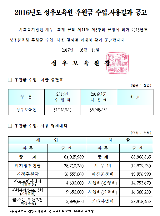 19-03-28 11:37 (공고) 2016년 후원금 수입 및 지출명세서 페이지 정보 작성자 성우보육원 댓글 0건 조회 5,669회 본문 2016년 후원금 수입 및 지출명세서 목록 댓글목록 댓글목록 등록된 댓글이 없습니다.