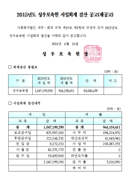 19-03-28 11:31 (재공고)2015년 시설회계 결산 페이지 정보 작성자 성우보육원 댓글 0건 조회 5,744회 본문 (재공고)2015년 시설회계 결산 목록 댓글목록 댓글목록 등록된 댓글이 없습니다.
