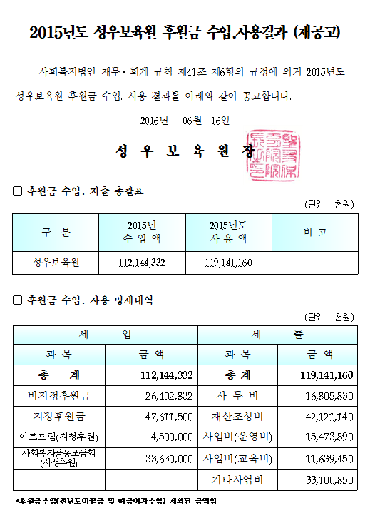 19-03-28 11:31 (재공고) 2015년 후원금 수입 및 지출명세서 페이지 정보 작성자 성우보육원 댓글 0건 조회 5,898회 본문 2015년 후원금 수입 및 지출명세서 목록 댓글목록 댓글목록 등록된 댓글이 없습니다.
