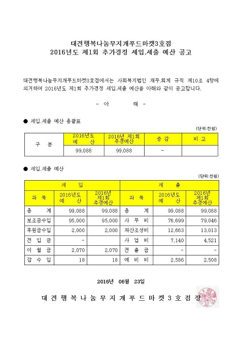 19-03-28 11:32 행복나눔무지개푸드마켓3호점 2016년도 제1회 추가경정 세입.세출 예산공고 페이지 정보 작성자 성우보육원 댓글 0건 조회 6,191회 본문 행복나눔무지개푸드마켓3호점 2016년도 제1회 추가경정 세입.세출 예산공고 목록 댓글목록 댓글목록 등록된 댓글이 없습니다.