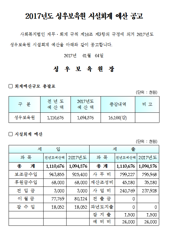 19-03-28 11:35 2017년 성우보육원 시설회계 예산 공고 페이지 정보 작성자 성우보육원 댓글 0건 조회 5,879회 본문 2017년 성우보육원 시설회계 예산 공고 목록 댓글목록 댓글목록 등록된 댓글이 없습니다.
