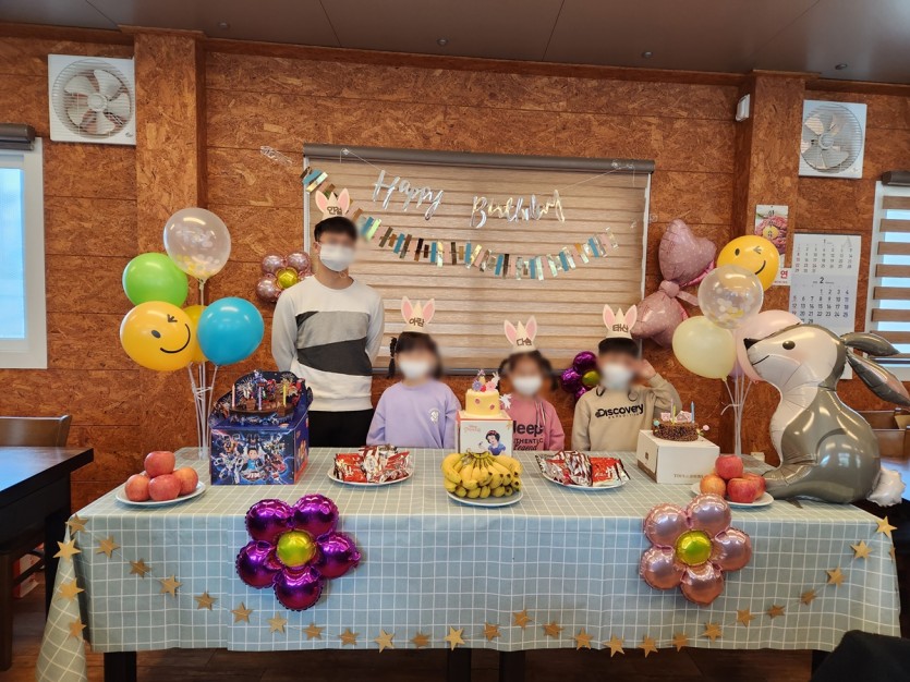 생일자인 아동들은 자신의 이름이 새겨진 고깔모자와 귀여운 풍선을 보고