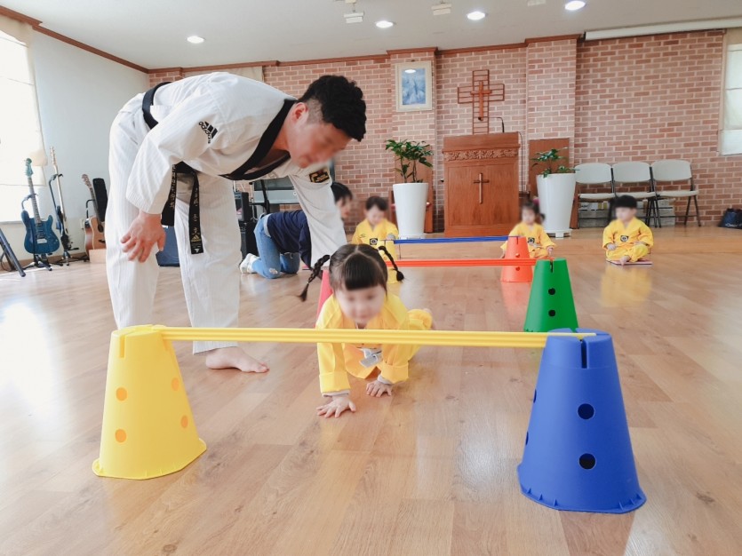 허리 손 차!차! 사랑합니다! 인사하며 관장님께 배우는 태권슐레는 아이들이 활발하게 뛰어놀며 신나게 활동하는 시간입니다.