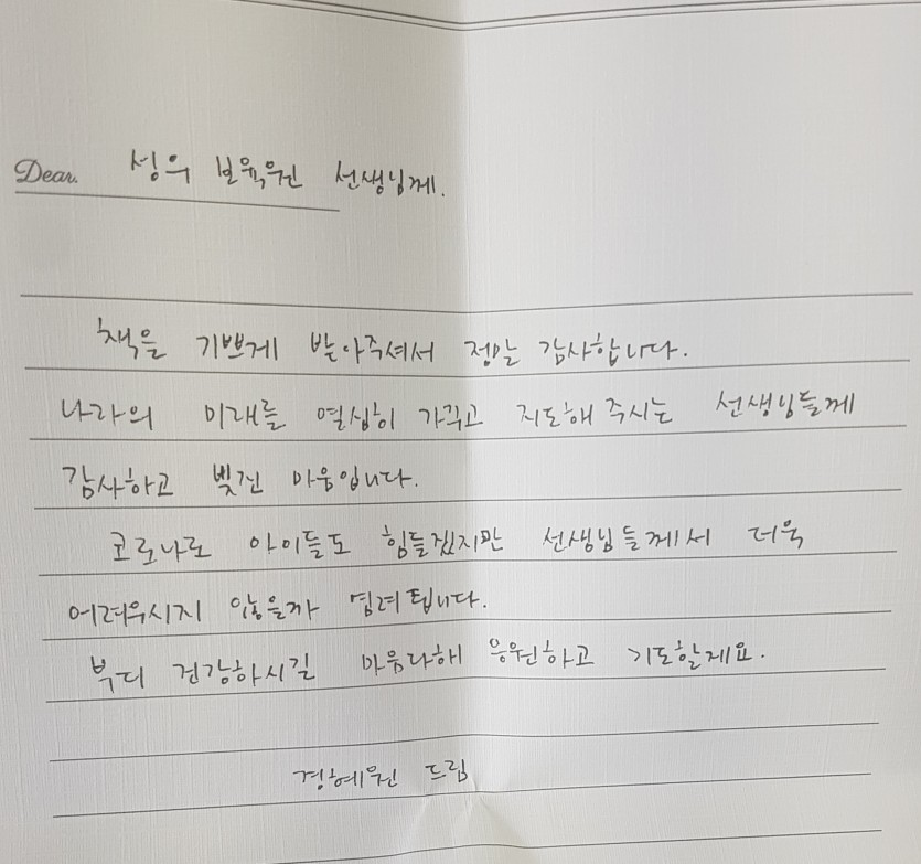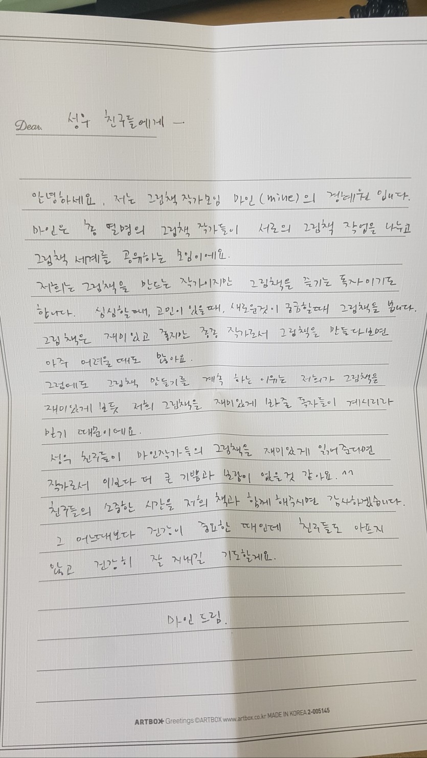 20200527 마인(mine-그림책작가모임)의 마음 따뜻한 책 선물 페이지 정보 작성자 성우보육원 댓글 0건 조회 5,501회 본문 마인(mine)이라는 그림책작가모임에서 성우아이들을 위해 마음 따뜻한 손편지와 함께 책 선물을 후원해주셨습니다.우리 아이들을 '나라의 미래'라고 표현해주시는, 작가님들의 응원을 통해 오늘도 성우아이들은 사랑을 한가득 받게 되었습니다.^^성우아이들이 즐거운 상상의 나래를 맘껏 펼칠 수 있도록 도움을 주신 마인 작가님들께 감사의 인사를 드립니다. 목록 댓글목록 댓글목록 등록된 댓글이 없습니다.