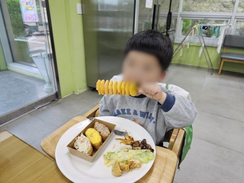 치킨샐러드, 회오리감자, 닭꼬치, 과일, 아이스크림, 다양한 유부초밥과 같은