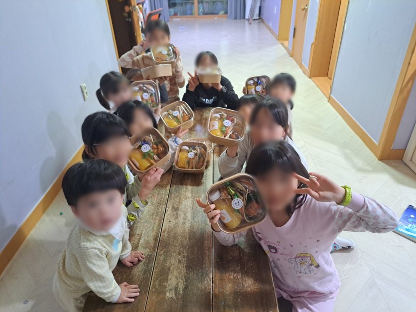 보기만 해도 군침이 도는 크로아상 샌드위치와 치킨, 상큼한 오렌지 주스와 간식까지 든든하게 구성되어 있는 도시락을 받은 아이들은