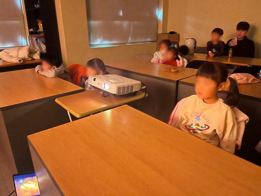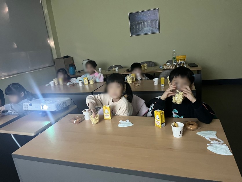 아이들은 큰 스크린으로 영화관에서 보듯이 재미있게 영화관람 하였고