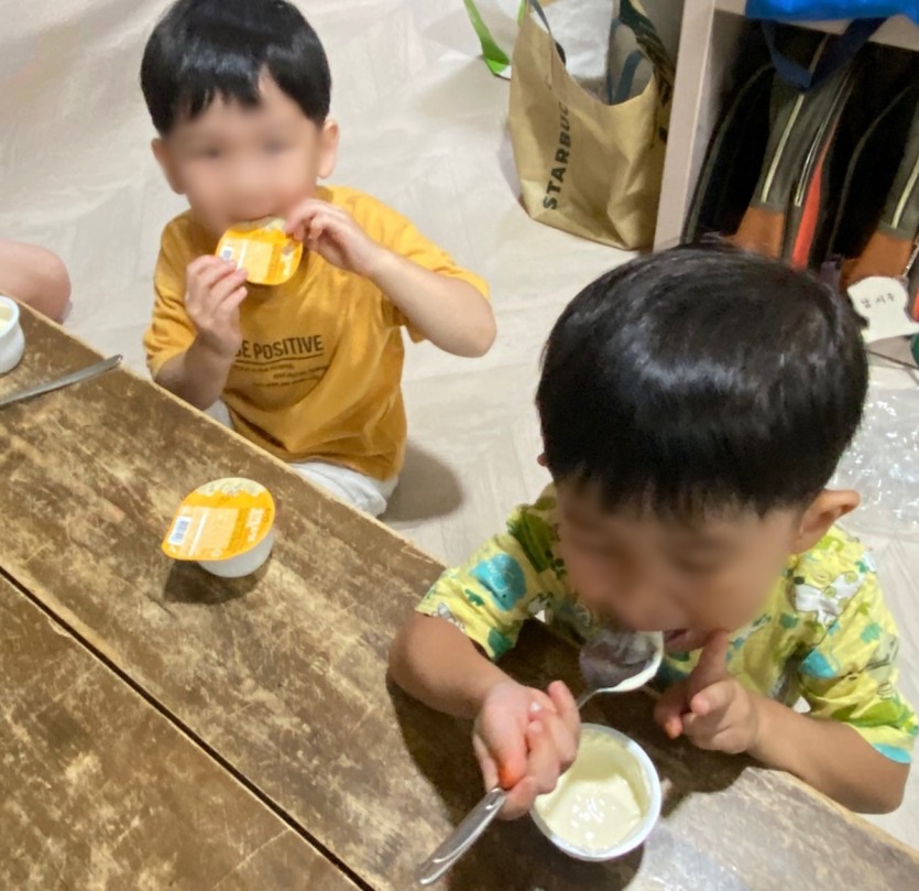 저녁 식사 후 모두 모여 부드러운 생크림 요플레를 맛있게 먹으며